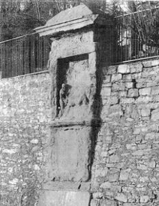 Stationssockel, Reliefplatte, Rahmenfries, Architravbalken, Kranzgesims, Walmdach, Wappenkartusche, Bekrönungskreuz, Pfeilerhintermauerung.